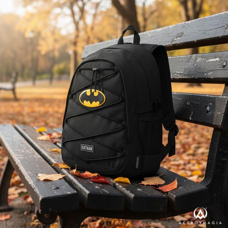 Gotham viaja contigo. La Mochila Batman DC Comics 44 cm une el icono del Caballero Oscuro con funcionalidad diaria en un diseño negro limpio y contundente: emblema clásico en el frontal, cordón elástico para sujetar chaquetas o accesorios, tirantes acolchados para mayor confort, bolsillos laterales de malla y un interior amplio que mantiene todo en su sitio. Con sus 44×31×20 cm organiza sin esfuerzo libros A4, cuadernos y estuche, perfecta como mochila escolar Batman, compañera urbana o para escapadas de fin de semana. Quien busca una mochila 44 cm Batman con estilo y practicidad encuentra aquí un aliado resistente y cómodo para clases, trabajo y ocio. Completa tu colección de merchandising Batman con una mochila Batman que aporta presencia, orden y calidad en cada día.