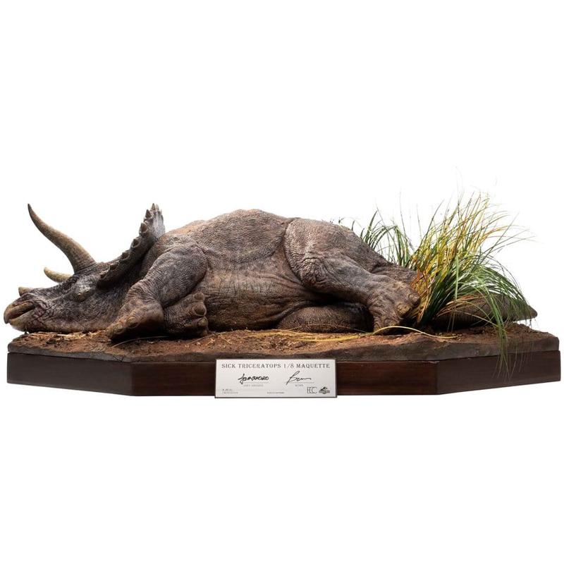 La maqueta Jurassic Park Sick Triceratops 1/8 representa uno de los momentos más memorables del cine con un nivel de fidelidad que transmite emoción, realismo y respeto absoluto por la obra original de 1993. Esta estatua de Jurassic Park reproduce con precisión la escena del Triceratops enfermo, capturando la majestuosidad del animal y la sensibilidad narrativa que convirtió esta secuencia en historia del cine. Con 96 cm de ancho, esta figura coleccionable de Jurassic Park se convierte en una pieza central imponente, pensada para coleccionistas exigentes que valoran la autenticidad y el detalle artesanal. Esculpida por el artista de ILM Bitan y pintada a mano por Joey Orosco, artista clave del equipo original de Jurassic Park, la textura de la piel, la postura del cuerpo y la integración con la base escénica evocan el mismo realismo que el animatrónico diseñado por Stan Winston, incluyendo el acabado terroso característico de los grandes herbívoros. Fabricada en resina de alta calidad, con ojos de cristal de nivel cinematográfico y una base temática cuidadosamente diseñada, esta estatua de Triceratops Jurassic Park no es solo un objeto decorativo, sino una pieza de colección de edición limitada a 150 unidades en todo el mundo, hecha bajo pedido y acompañada de certificado de autenticidad firmado a mano por los artistas. Es una obra que conecta nostalgia, cine y arte escultórico, ideal para quienes buscan una maqueta de dinosaurio a escala 1/8 que aporte valor real, exclusividad y una presencia visual impactante en cualquier colección de cine.