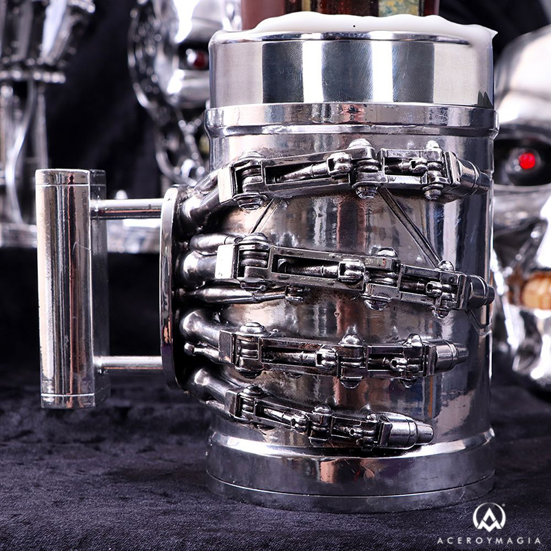 Impresionante Jarra de Cerveza con la mano de Terminator T-800. Esta preciosa obra de arte está realizada en acero inoxidable y resina con una capacidad 600 ml, con unas dimensiones aproximadas 16 x 14,7 x 11,1 cm. Probablemente una de las mejores jarras que veas del famoso personaje interpretado por Arnold Schwarzenegger. La jarra está pintada a mano y puede retirarse la parte de acero inoxidable para facilitar la limpieza. No dejes pasar el regalo perfecto para los fans de Terminator y de la cerveza bien fresquita. No apto para lavavajillas y microondas. www.aceroymagia.com