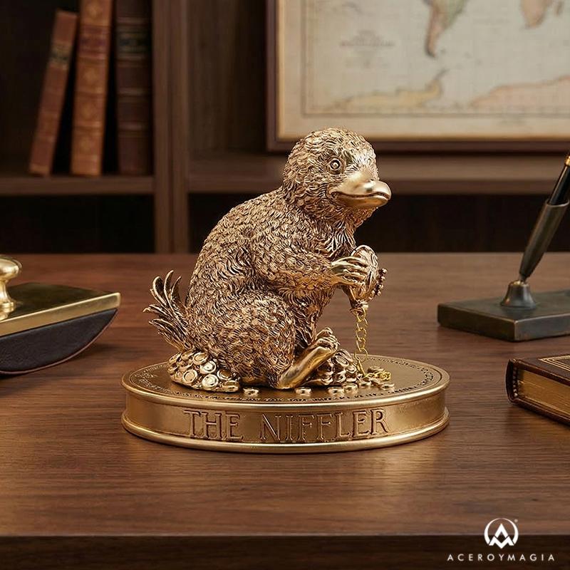 Hay piezas que no solo decoran una estantería, sino que capturan al instante la esencia del universo mágico, y esta Figura Niffler Harry Potter lo consigue con una presencia visual espectacular. Inspirada en una de las criaturas más carismáticas del mundo de Animales Fantásticos, esta figura muestra al Niffler aferrado a su botín con ese aire travieso que lo convirtió en uno de los personajes más recordados por su debilidad por los objetos brillantes. Realizada en resina, ofrece un acabado con relieve muy marcado que potencia la textura del pelaje, las monedas y la base, creando una pieza decorativa con gran riqueza visual y un aspecto cuidado desde cualquier ángulo. Su tamaño de 14 x 10 x 14 cm la hace muy fácil de colocar en una vitrina, una balda, un escritorio o junto a otros artículos de colección, aportando personalidad sin ocupar demasiado espacio. La escena tiene además un diseño muy reconocible para quienes valoran los detalles del universo de Harry Potter, ya que representa perfectamente el carácter codicioso, curioso y entrañable del Niffler, una criatura famosa por sentirse atraída por tesoros y metales preciosos. Esta figura Niffler resina resulta ideal para regalar o para completar una colección con una pieza llamativa, elegante y con temática cinematográfica, porque combina un formato compacto con una estética muy vistosa y un modelado que transmite movimiento y expresión.